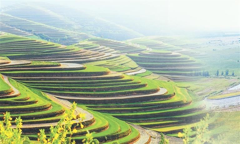 甘肃地处黄土高原、青藏高原、内蒙古高原三大高原交汇处,境内水土流失曾一度成为生态发展的“心腹之患”,昔日的庄浪是“十山九破头、肥土冲到沟里头”。如今,庄浪县梯田建设实现了“水不出田,土不下山”,黄土坡变成了稳产高产的“粮仓”。