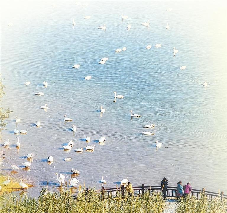 河南三门峡黄河湿地灵宝段千余只大天鹅在湿地水域中游弋、嬉戏。河南日报供图