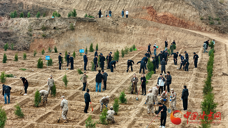 义务植树活动现场,大家挥锹铲土、培土围堰、提水浇灌,共栽植乡土树种侧柏、刺槐等苗木8万株,完成植树1000亩。同时,三北“六期”渭河上游南部秦岭西段水源涵养与生物多样性保护恢复人工造林、退化林修复和封山育林项目盘龙山车家林实施区内工人们正在热火朝天地开展植树造林,今年计划栽植当地乡土树种油松、桦山松、刺槐、山杏等苗木128万株,全面完成盘龙山区域8万亩造林任务。