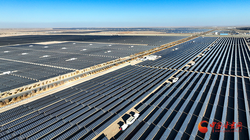 蓝色光伏板在阳光下熠熠生辉,横亘戈壁、阻隔风沙