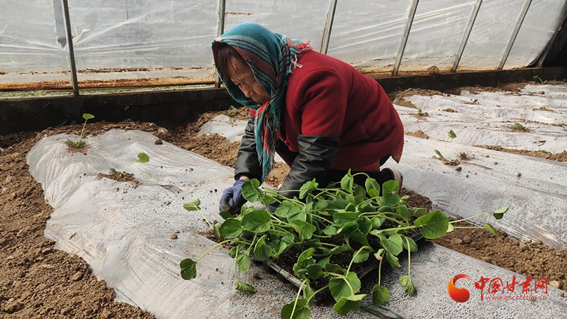 村民们在蔬菜大棚里移栽西葫芦苗