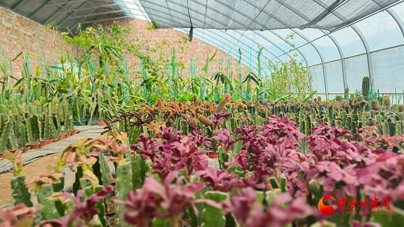 “这是嫁接培育的‘桃太郎’仙人球品种,在这个枝干上一共嫁接了十个芽点。”王宗一边展示,一边熟练地介绍着品种特性。他自幼便对花卉种植情有独钟,早年在外务工期间,他深耕花卉培育领域,潜心学习种植技术,积累了扎实的专业功底和丰富的实践经验。2022年,怀揣着返乡创业的梦想,王宗承包了李堡村的温室大棚,凭着一腔热爱与过硬技术,正式开启了特色花卉种植之路,成为当地懂技术、敢闯敢干的新时代新农人。