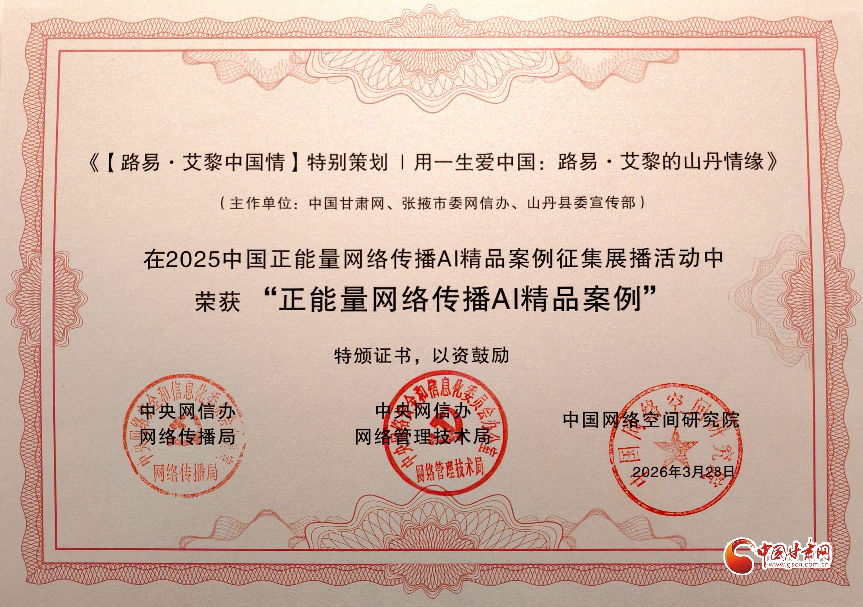 该作品入选2025中国正能量网络传播AI精品案例,不仅是对作品创新性和传播力的肯定,还是对中国甘肃网在创新网络传播方式、弘扬正能量方面的充分肯定,更彰显了甘肃在网络正能量传播领域的卓越成就。
