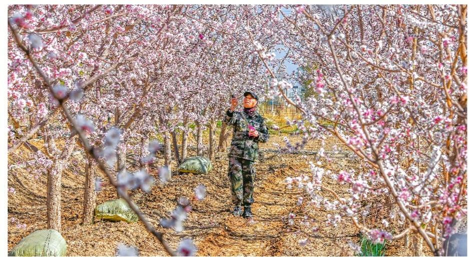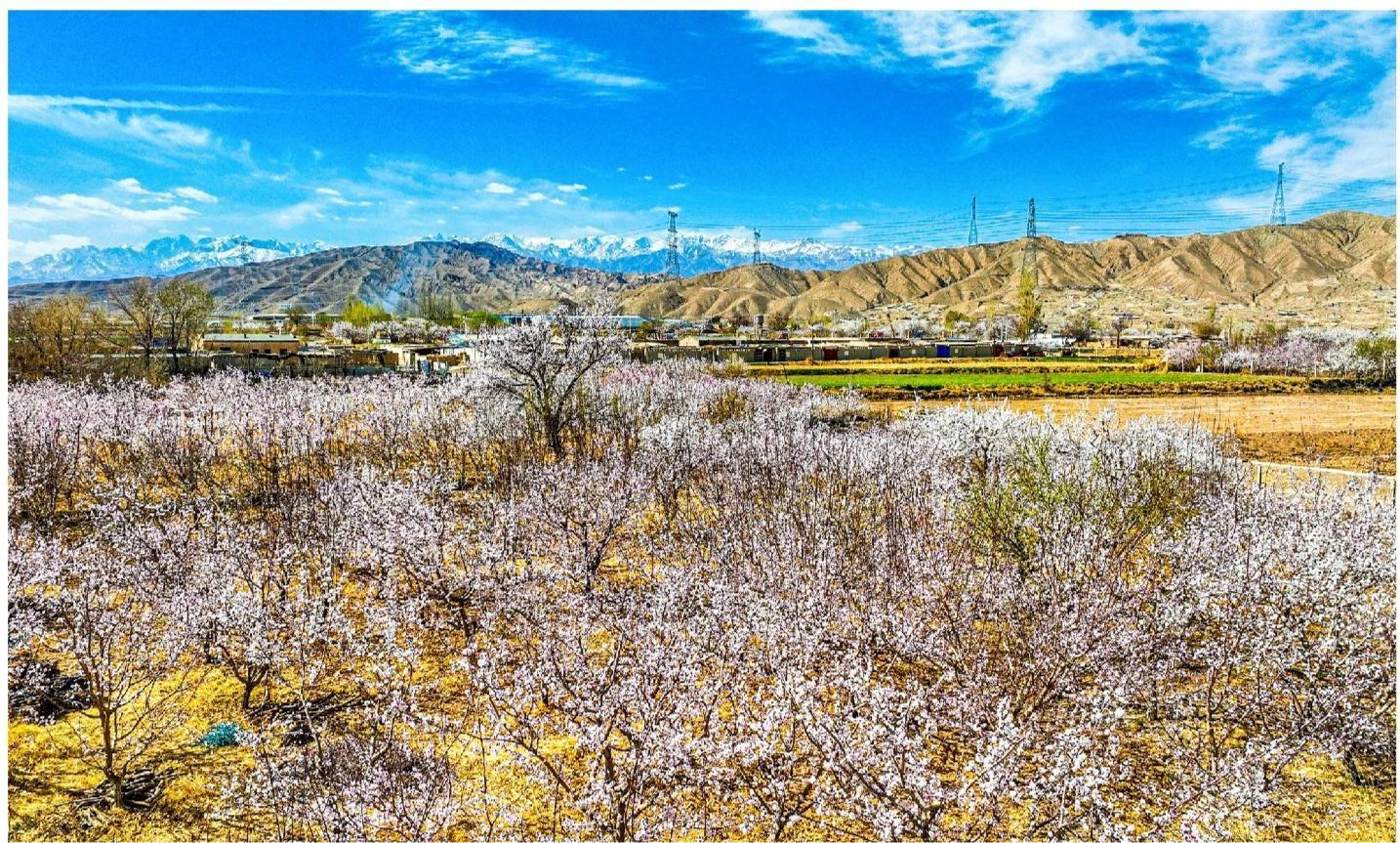 中国甘肃网4月10日讯 据嘉峪关日报报道(融媒体中心记者 李巍 信树勋 摄影报道)近日,文殊镇“千树”杏花竞相绽放。在暖阳照耀下,粉白花瓣晶莹剔透,趁着微风,浮动幽香,与远处的祁连雪峰遥相呼应,尽展春日的浪漫。