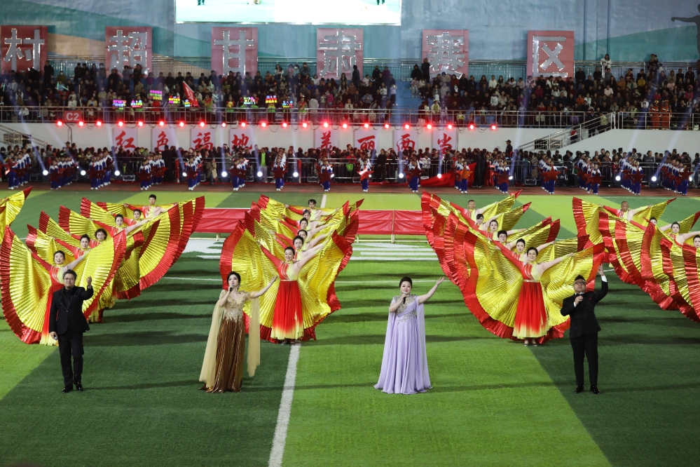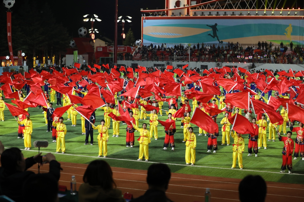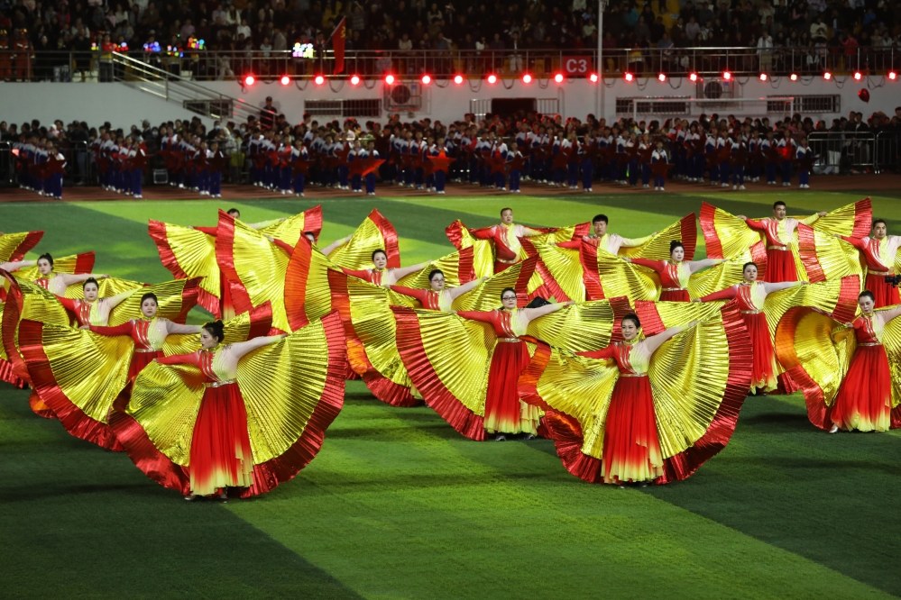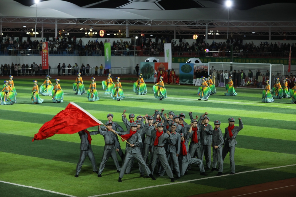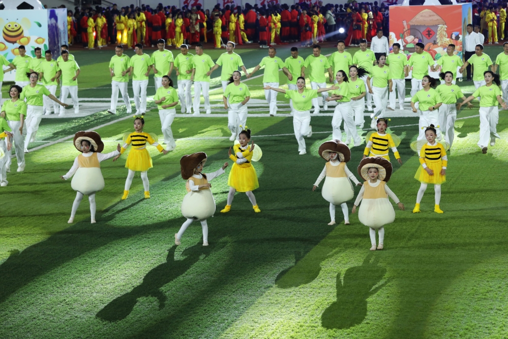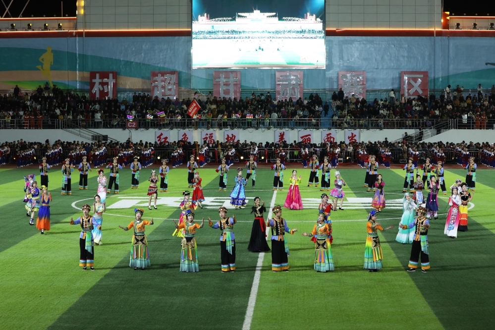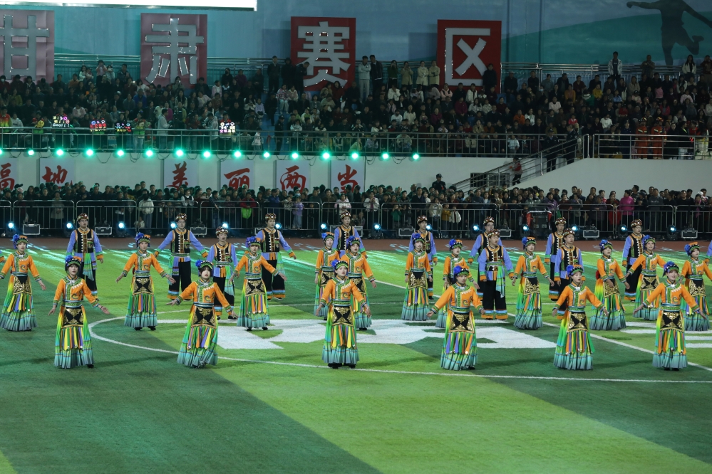 4月10日晚,在甘肃省陇南市两当县体育场,当地小学生、干部职工和舞蹈演员进行《薪火绿茵梦》主题曲伴舞演出。新华社记者 张智敏 摄