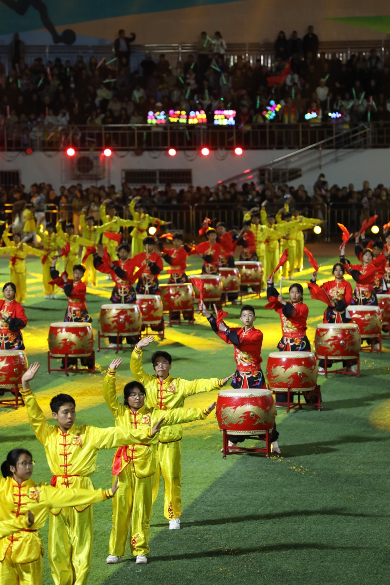 4月10日晚,在甘肃省陇南市两当县体育场,两当香泉中学学生进行《鼓舞中华·盛世华章》表演。新华社记者 张智敏 摄