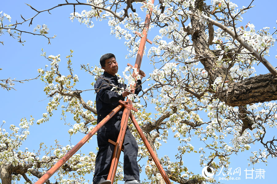 在一棵古梨树旁,什川镇上车村果农魏周玉正踩着7米多高的“天把式”云梯,手持1米长的竹竿,娴熟地为梨树进行人工授粉。“这种传统‘天把式’云梯轻便易搬运,能很好地适应林间环境,上树授粉、采摘都方便。”魏周玉说,“人工授粉让古梨树融入新品种的基因,结出的果实皮薄肉嫩、清甜多汁,去年我家种的梨树总产量达到上万斤。”
