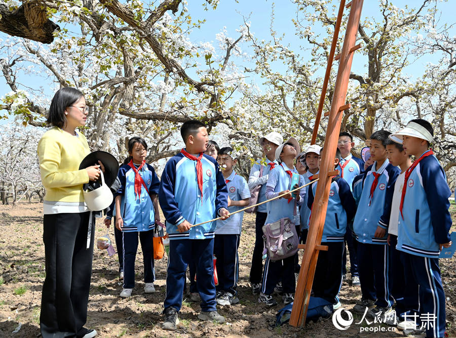 “冬果梨先开花,后长叶,软儿梨则花叶同发。”树下,皋兰县什川明德小学教师刘晓斌带领孩子们开展春游研学活动。她教孩子们辨别软儿梨与冬果梨的差异,细致讲解掸花、人工授粉等管护技巧,让孩子们在花海中亲近自然,感受古梨园深厚的文化底蕴。