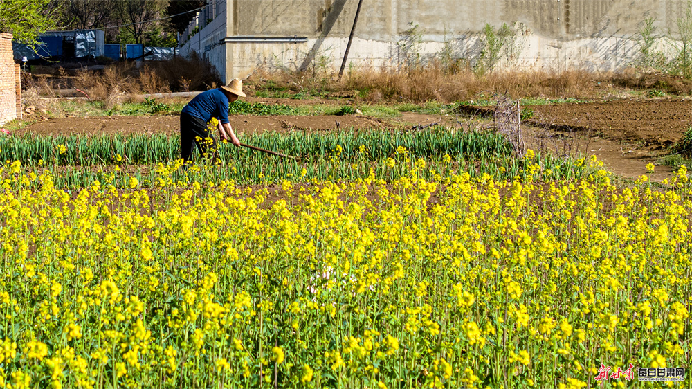 田埂边,桃花娇艳绽放,油菜花满目金黄,缤纷春色与田间忙碌的身影相映成趣,勾勒出一幅生机盎然、充满希望的陇东春耕画卷。