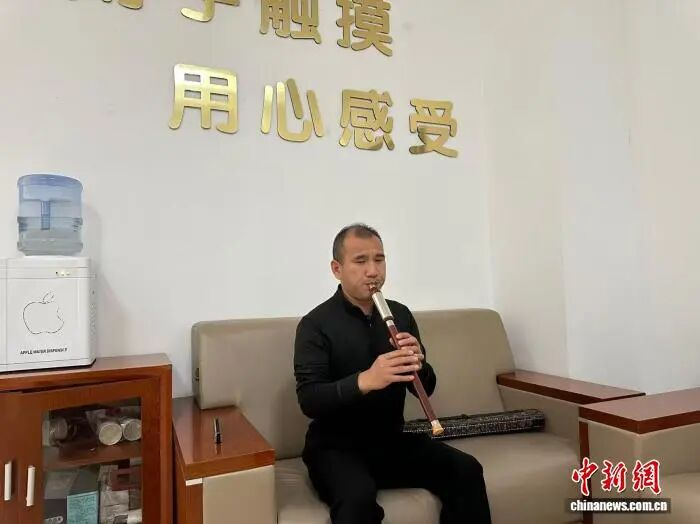 4月初,兰州市城关区,盲人按摩师马述靖利用闲暇时间自学乐器。闫姣 摄
