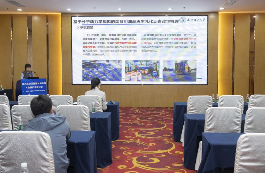 本次研讨会上,林梅副教授、吴淑娟副教授分别在“再生路面界面行为与结构强韧机制”“路面多尺度仿真与数值模拟方法”分会场作了题为《西北寒旱区老化及再生沥青胶结料多尺度研究》《基于分子动力学的废食用油基再生乳化沥青改性机理分析》的报告,得到了参会专家的一致好评。